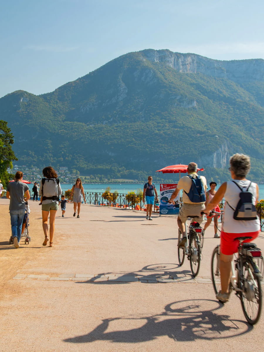 I vantaggi della bicicletta. La pista ciclabile di 42 chilometri che circonda il lago parte proprio davanti alla maggior parte delle proprietà sul lungolago. Ho noleggiato delle biciclette dalle stazioni automatizzate al costo di 2 € all’ora e il percorso pianeggiante lungo il lago porta a Talloires in 45 minuti senza salite ripide che potrebbero stancare i ciclisti occasionali.